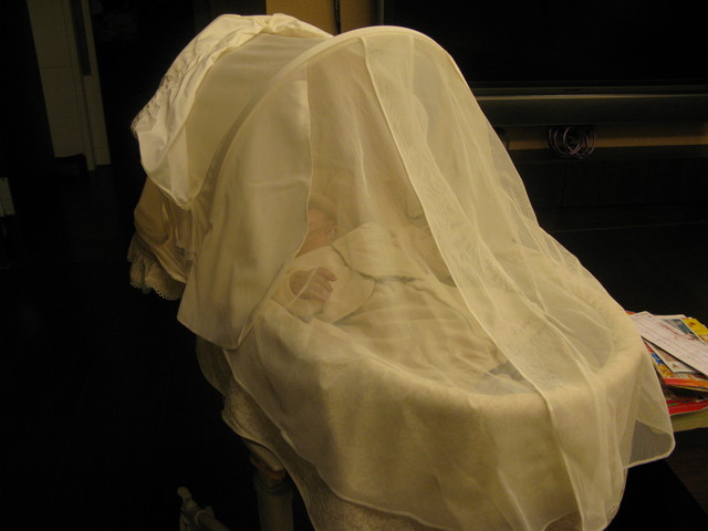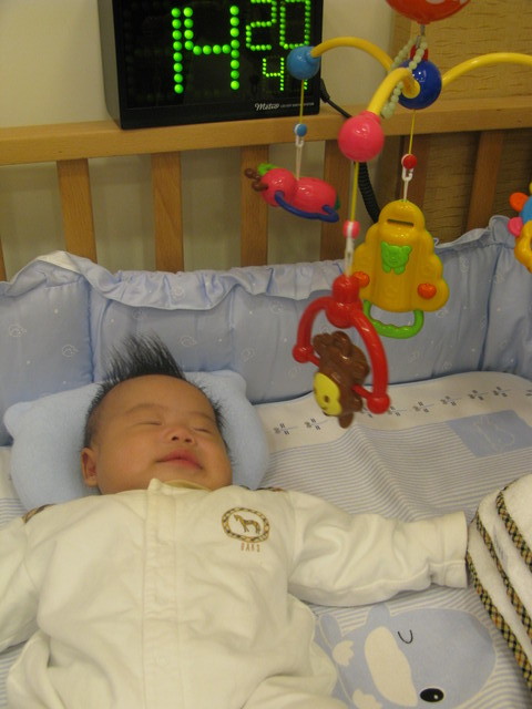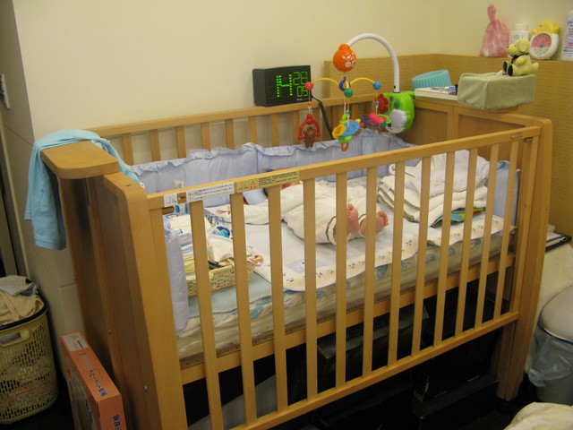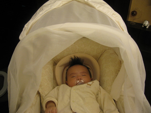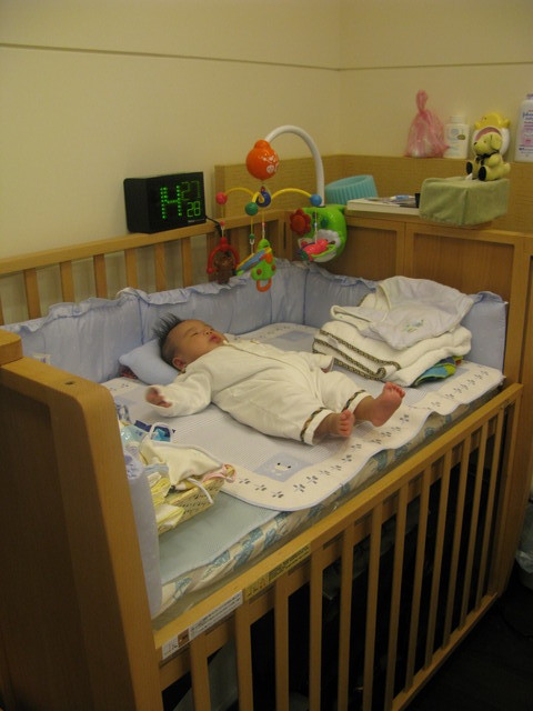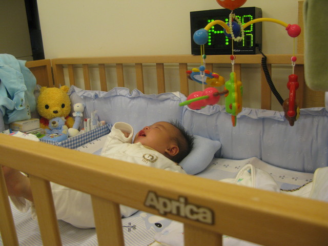 一般而言大家覺得嬰兒床可有可無...但我們還是買了...這是APRICA幸福之床系列..比一般嬰兒床貴不少...主要一方面品牌因素..一方面它還可變化為單人床...我沒買第一階段的吊床...現在小豪身形較小時我们開始訓讓他橫著睡(如圖),希望他能習慣.